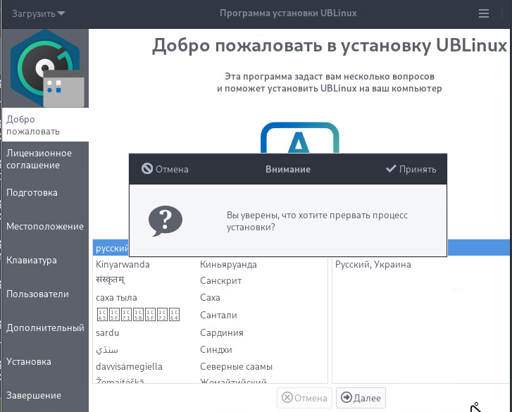 > > 1. На отмену должно появляться сообщение-предупреждение "Вы хотите прервать установку?", в дизайне оно есть, с двумя кнопками "Отмена" и "Применить" (или принять, как Дмитрий скажет).