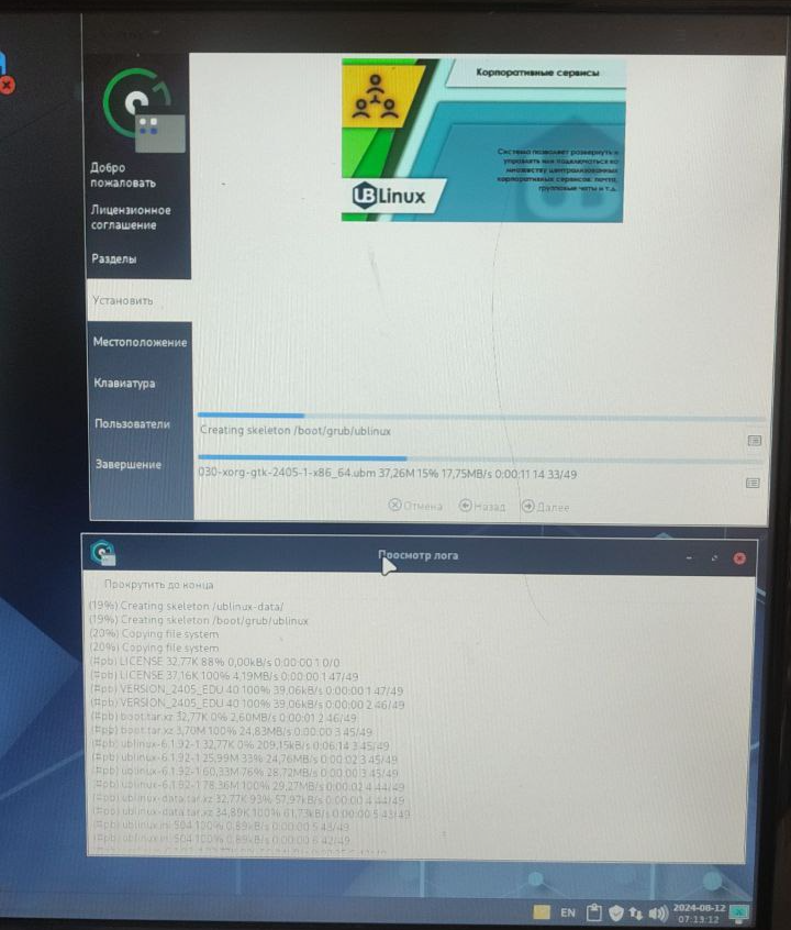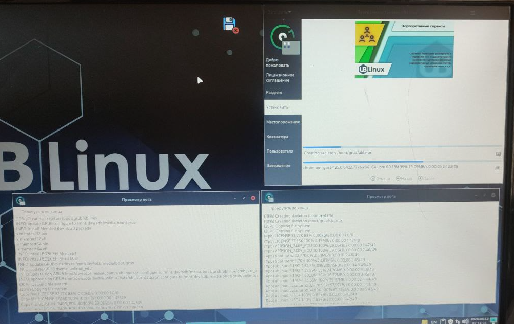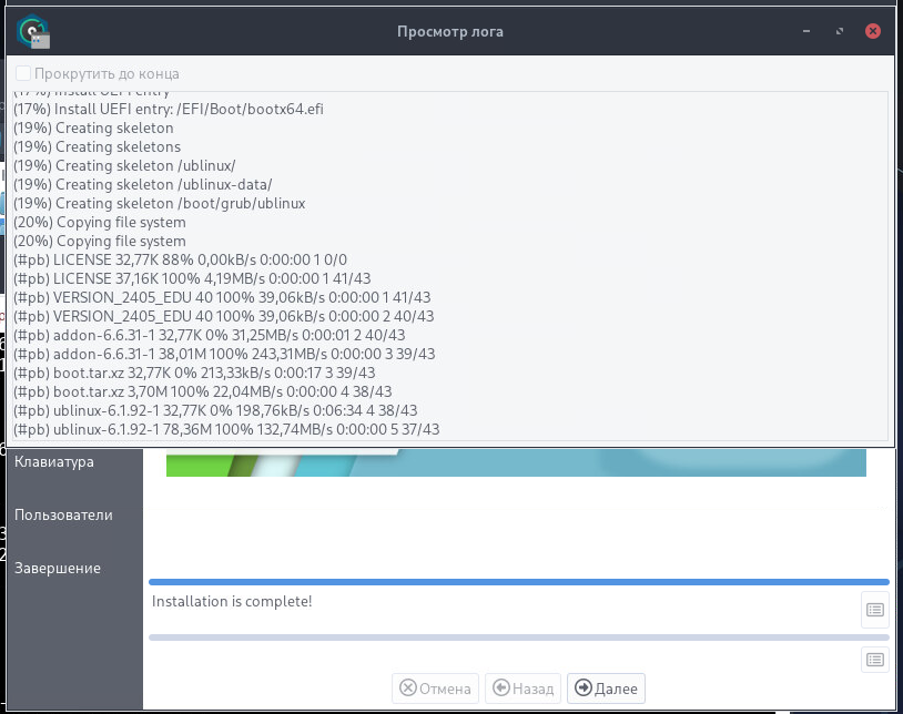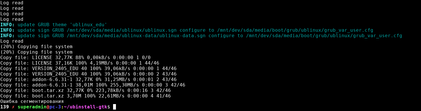 sudo gdb --args ubinstall-gtk -c -dво время установки выводят непонятно что, пока не закончишь доп настройки, так и должно?я проверю, но там две кнопки для логов, но вторую из них по какой-то причине можно увидеть только когда появляется вторая полоска прогресса