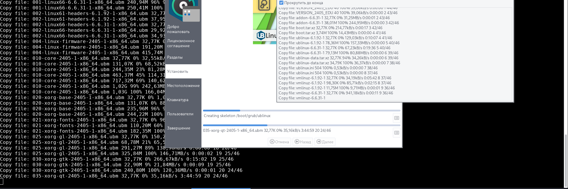 Логи под запуском `sudo gdb --args ubinstall-gtk -c -d` во время установки выводят непонятно что, пока не закончишь доп настройки, так и должно?