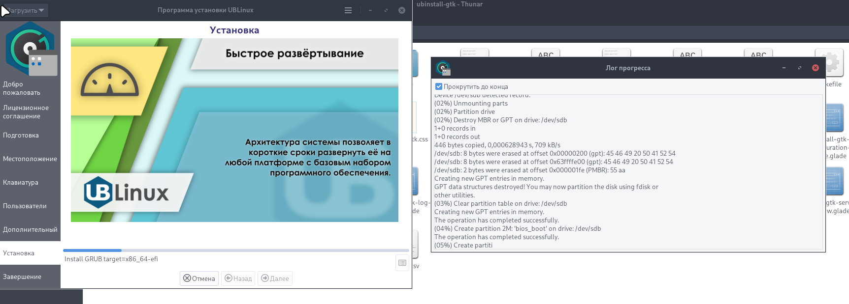 Логи под запуском sudo gdb --args ubinstall-gtk -c -d во время установки выводят непонятно что, пока не закончишь доп настройки, так и должно?