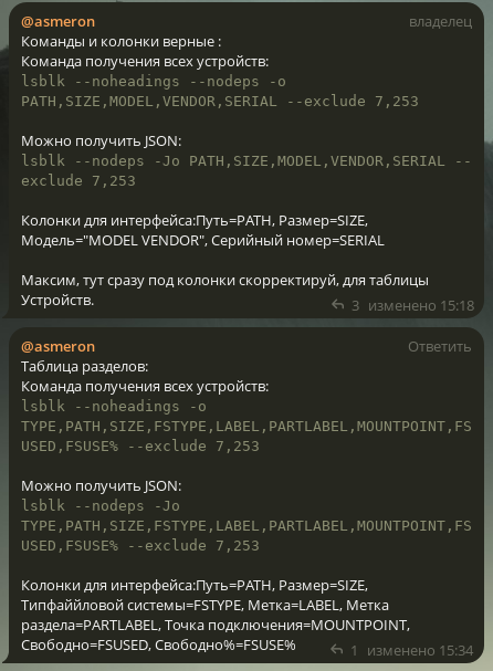 > Колонки для интерфейса:Путь=PATH, Размер=SIZE, Типфаййловой системы=FSTYPE, Метка=LABEL, Метка раздела=PARTLABEL, Точка подключения=MOUNTPOINT, Свободно=FSUSED, Свободно%=FSUSE%