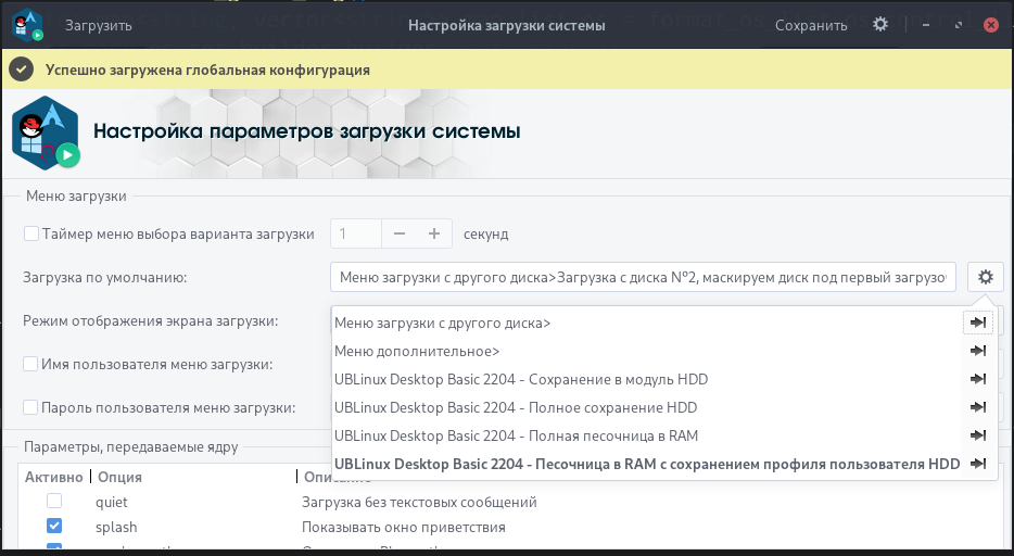 В комбобоксе "Загрузка по умолчанию" необходимо выделить пункт, который соответствует последнему режиму при котором система была удачно загружена.