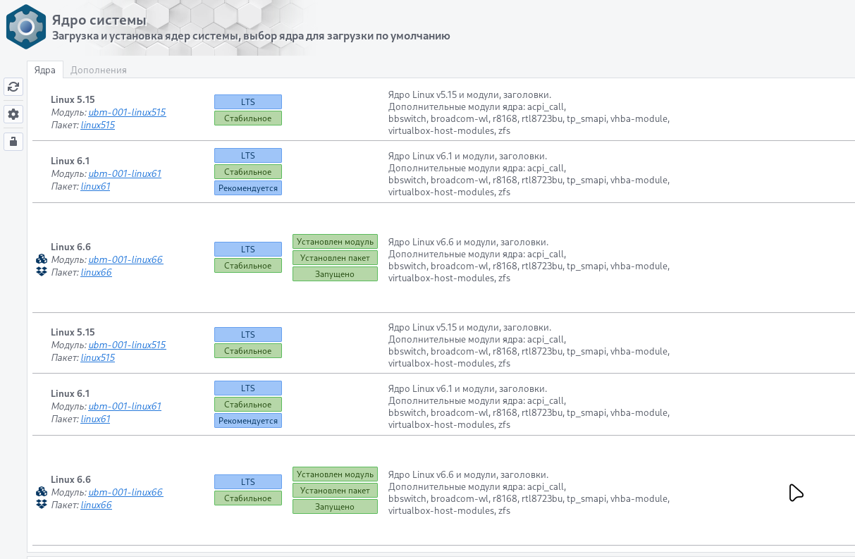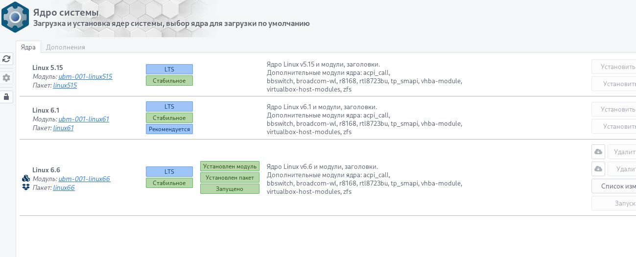 На обновленной системе при запуске утилиты выводится список из трех модулей на вкладке "Ядра", как и должно быть.