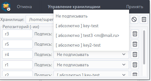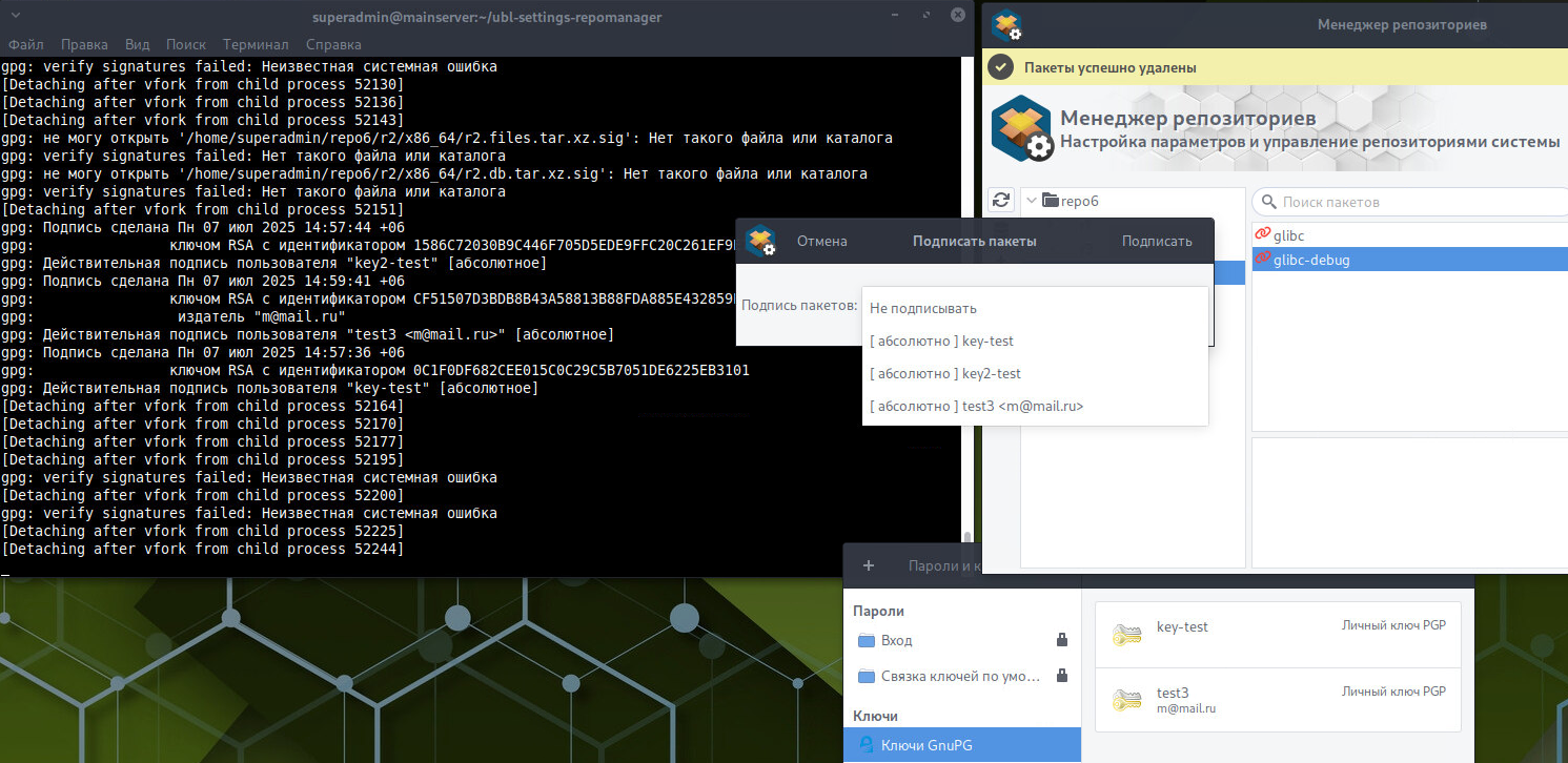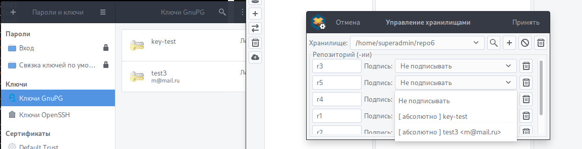 Я удалила ключ в системе, через Пароли и ключи, нажала Обновить в Репоменеджере и попыталась подписать пакет - в списке остался удаленный ключ.