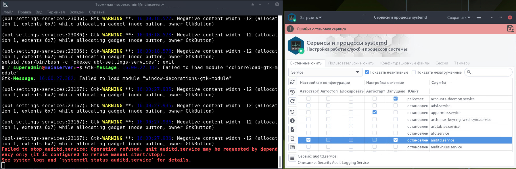 Сервис auditd.sevice выключать можно только через приложение Аудита