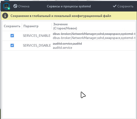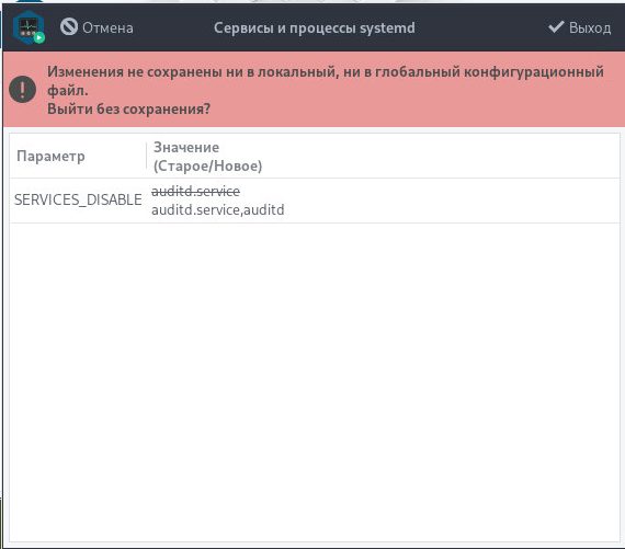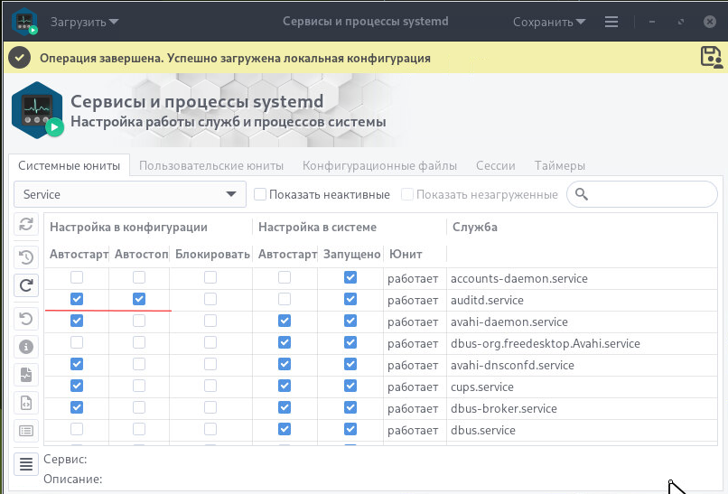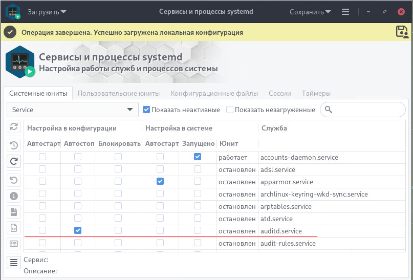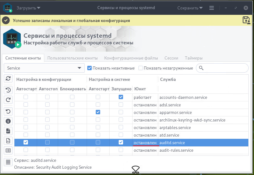 Сервис auditd был выключен, я его включила и сохранила обе конфигурации