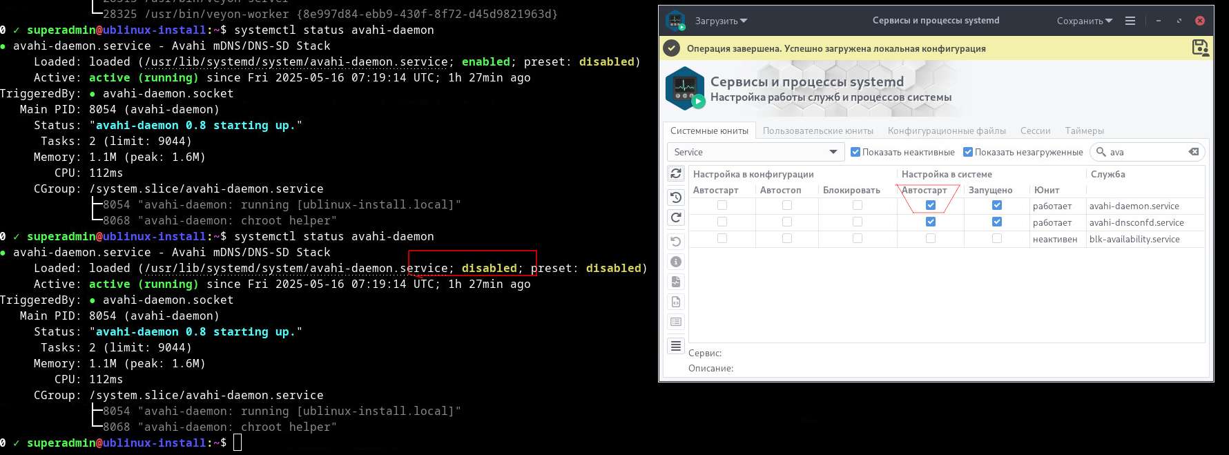 После последнего применения изменений avahi не пропадает после выключения (решено):