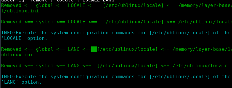 > ubconfig remove ["locale"] LOCALERemoved <== global <== LOCALE <== [/etc/ublinux/locale] <== /memory/layer-base/1/ublinux.ini