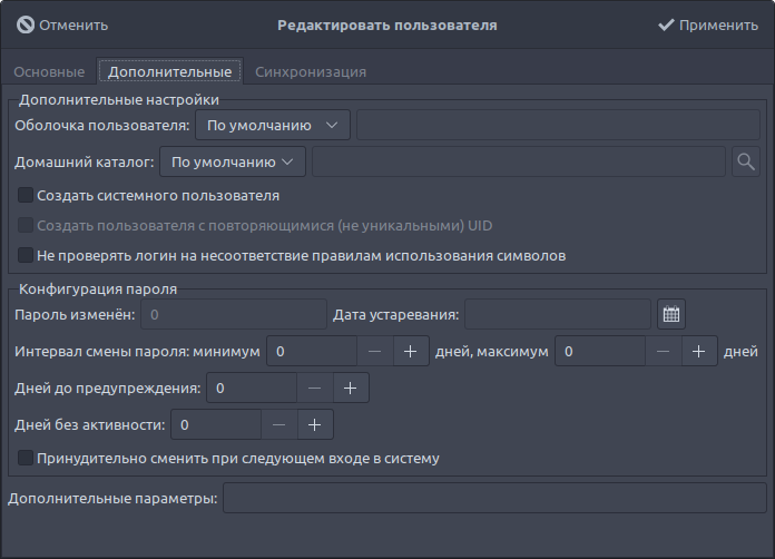 4. Почему в поле дополнительные параметры, если ничего не задано у пользователя, но стоит Домашний каталог по умолчанию, то в окне редактирования пользователя "Дополнительные параметры" стоит параметр "--home-dir /home/superadmin" ?