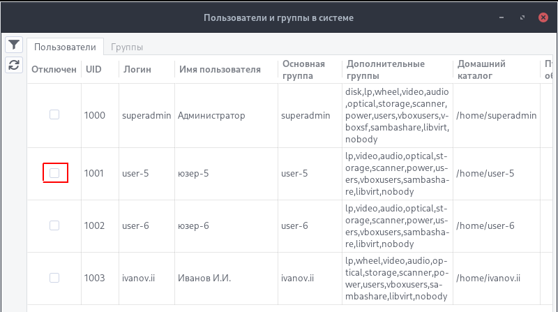 Юзер-5 не отмечен галочкой "отключен" в окне "Пользователи и группы в системе"