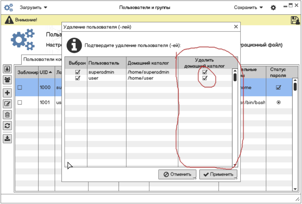 При удалении пользователя, должна быть галка, удалять или нет домашний каталог.