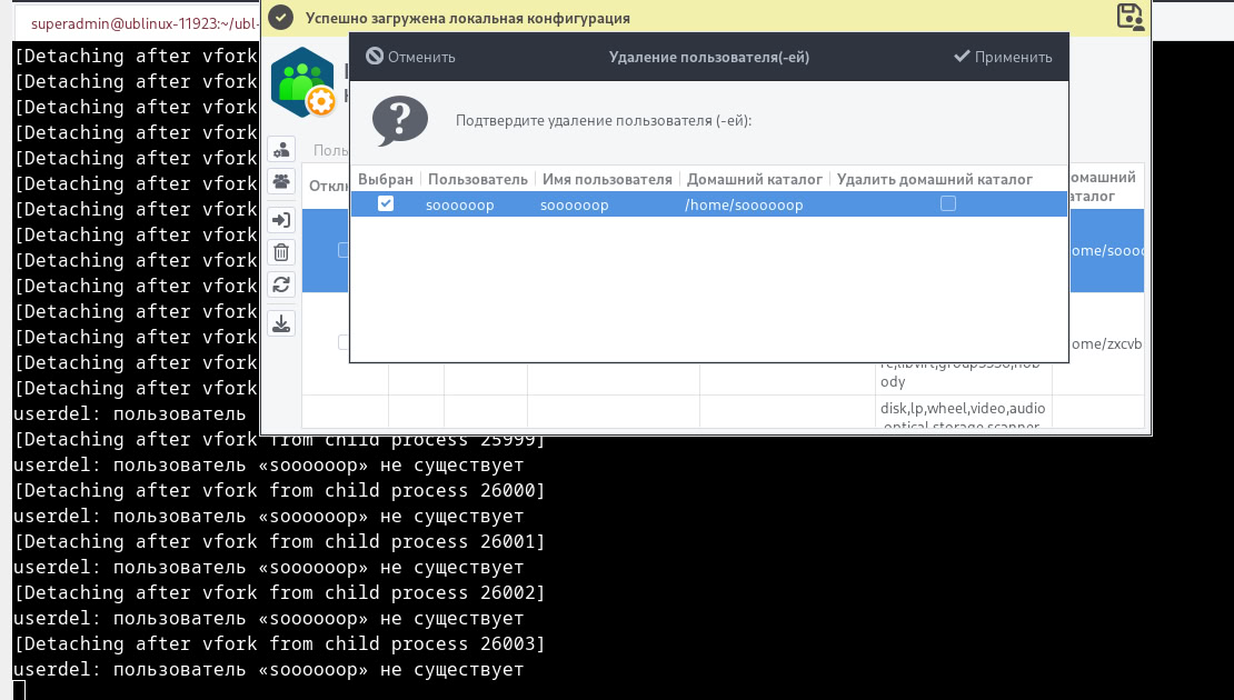 Эту закрываю, так как пользователь удаляется, но смежная задача - https://gitea.ublinux.ru/Applications/ubl-settings-usergroups/issues/198 на доработке.