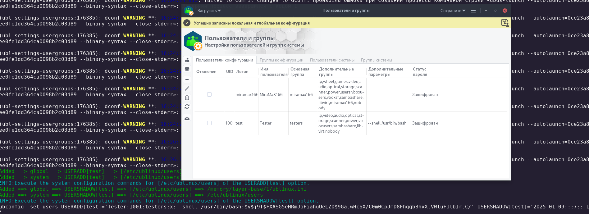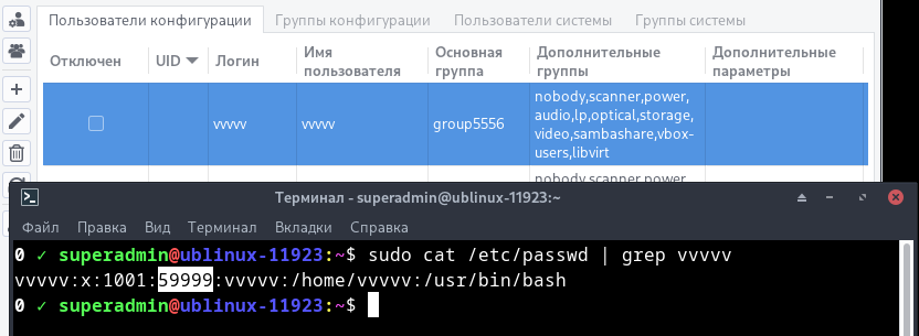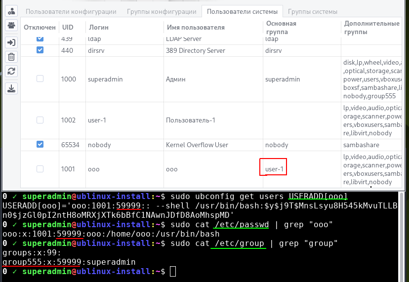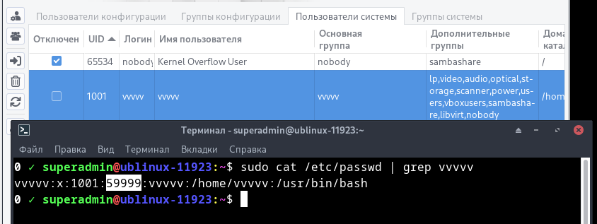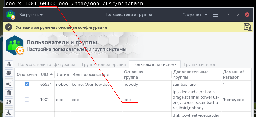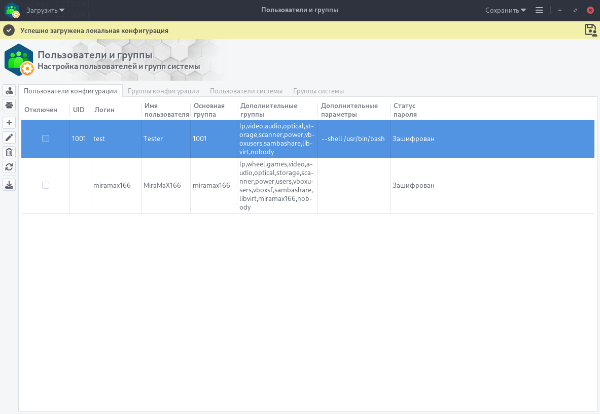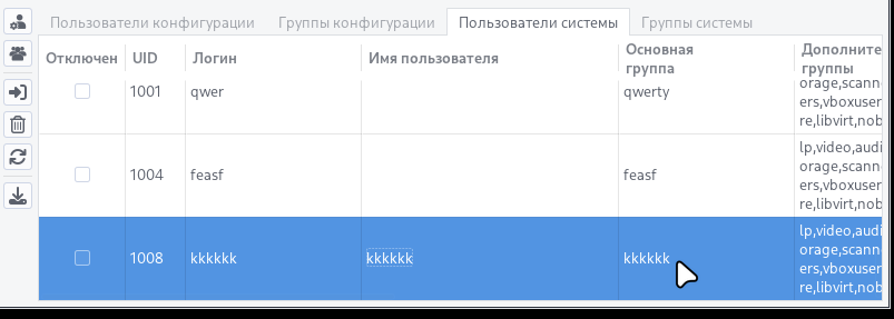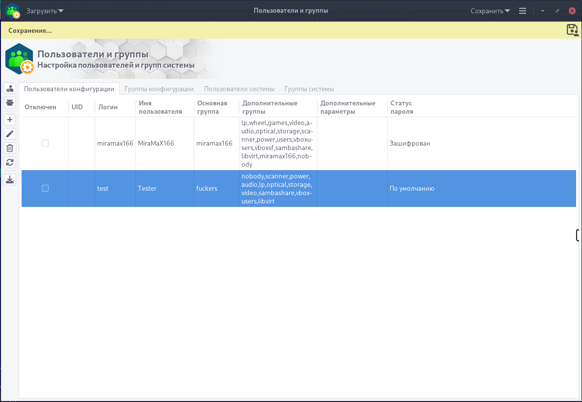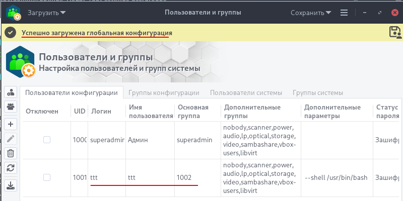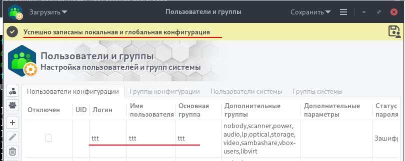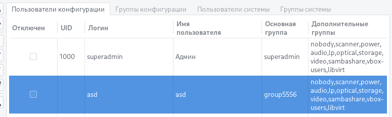 Потом я хочу изменить основную группу пользователя на любую другую мною добавленную. Изменяю, сохраняю также в обе конфигурации и во всех абсолютно файлах основная группа пользователя - успешно меняется, но в утилите ноль изменений на вкладке "Пользователи системы".