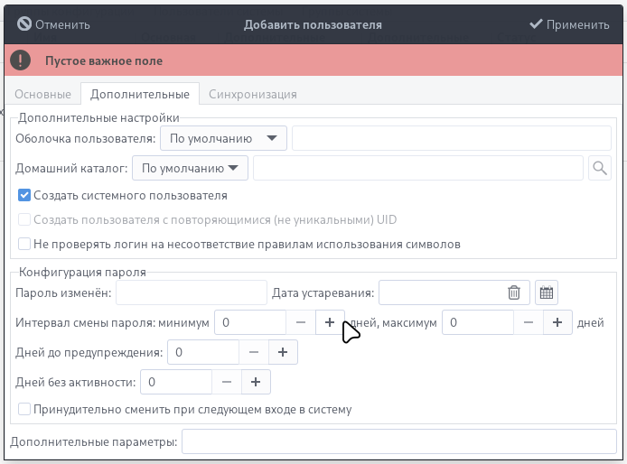 Что за важное поле, где оно, что не заполнено? Появляется в момент установки чекбокса на "Создать системного пользователя"