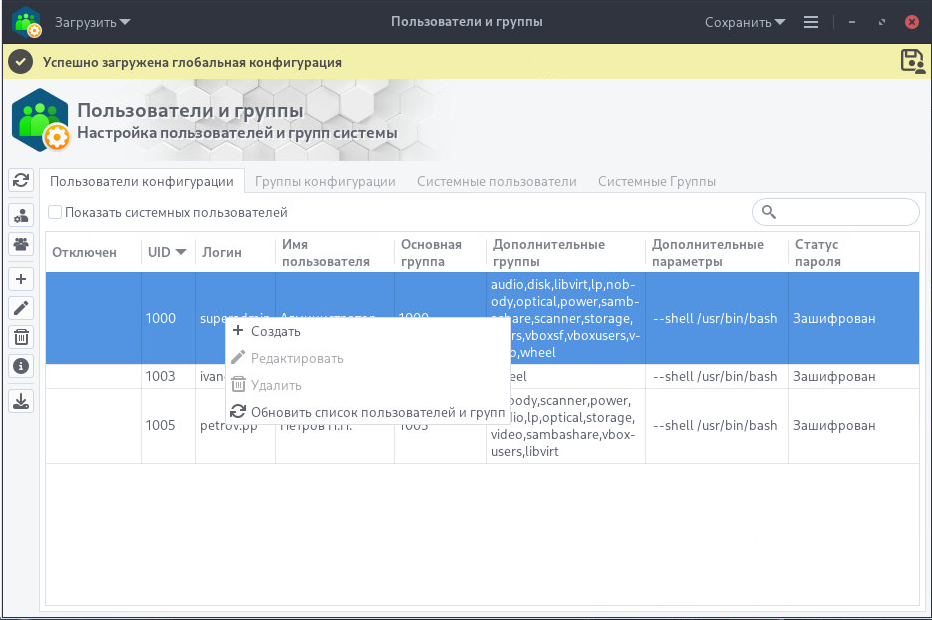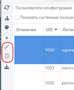 Если нажать Обновить, то ни один пользователь не выделен и если по нему кликнуть правой кнопкой, то пункты Редактировать и Удалить остаются неактивными