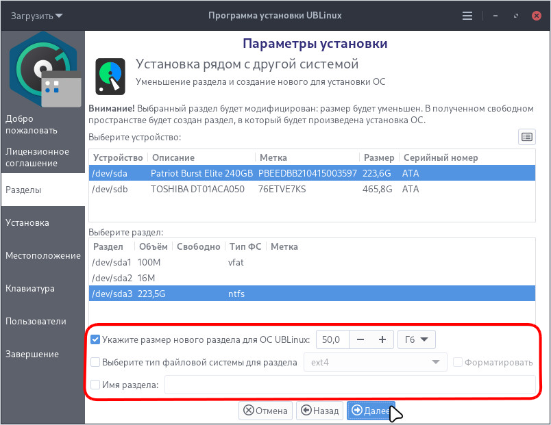 1. Только вот тут нет выбора размера раздела как на скрине в вики: