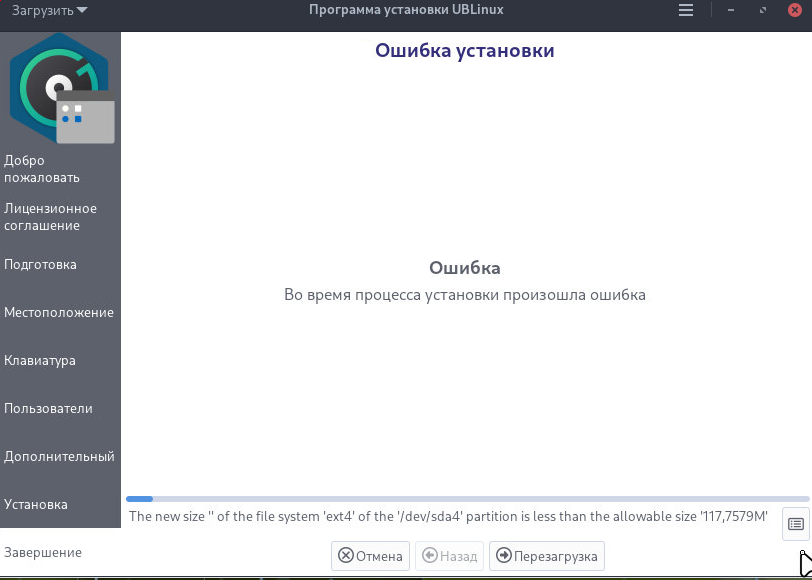 ERROR:The new size '' of the file system 'ext4' of the '/dev/sda4' partition is less than the allowable size '117,7579M'