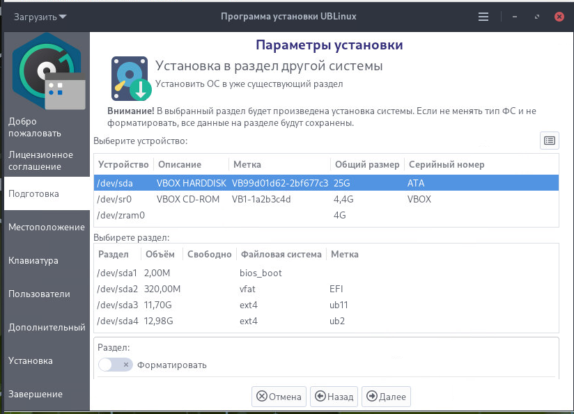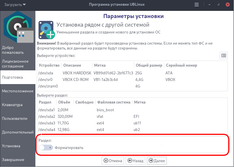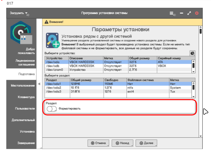 2. Зачем тогда у нас кнопка с GParted и тут, и в обычной установке, если там - это игнорируется и весь диск отводится под систему (возможно уничтожая данные пользователя), а тут - приводит к ошибке?