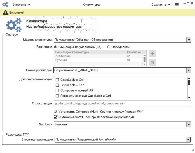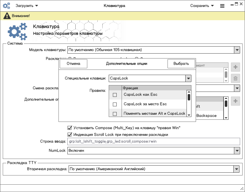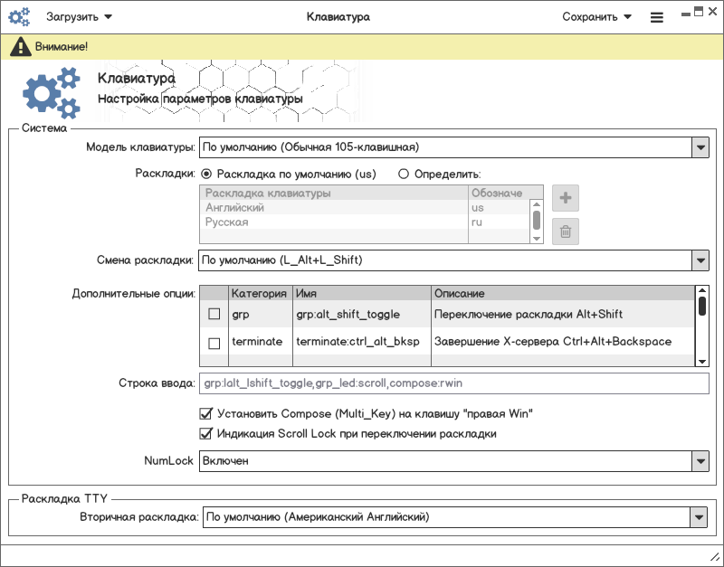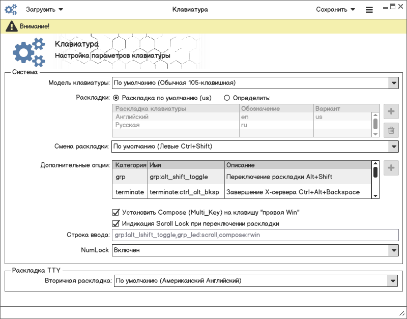 lsxkbmodels. Параметр в конфигурацииXKBMODELlsxkblayouts. Важна очередь в списке. По умолчанию всегда должна быть выбрана us галкой, и добивать вторую и последующие, пользователь должен иметь возможность списочный номер менять. Параметр в конфигурацииXKBLAYOUTперечисление через запятую.lsxkbvariantsв зависимости от раскладки, либо пусто. Сделать в одной таблице с раскладкой в отдельном столбце. Параметр в конфигурацииXKBVARIANTперечисление через запятую позиция должна соответствовать позиции раскладки.lsxkboptions_grpс описанием. Параметр в конфигурацииXKBOPTIONSперечисление через запятую.lsxkboptions_*. Выбираем тип фильрации и после непосредственно значение. Параметр в конфигурацииXKBOPTIONSперечисление через запятую."Строка ввода", перечень всех выбранных опций изXKBOPTIONS. Возможно заменить добавление пользовательского параметра в таблицу."ScrollLock"и"MultiKey"оставить отдельно, т.к. это удобно быстро ткнул и получил часто используемый функционал."NumLock", Параметр в конфигурацииNUMLOCK, имеет значение по умолчанию/включен/выключен.Используются обозначения из задачи #5
