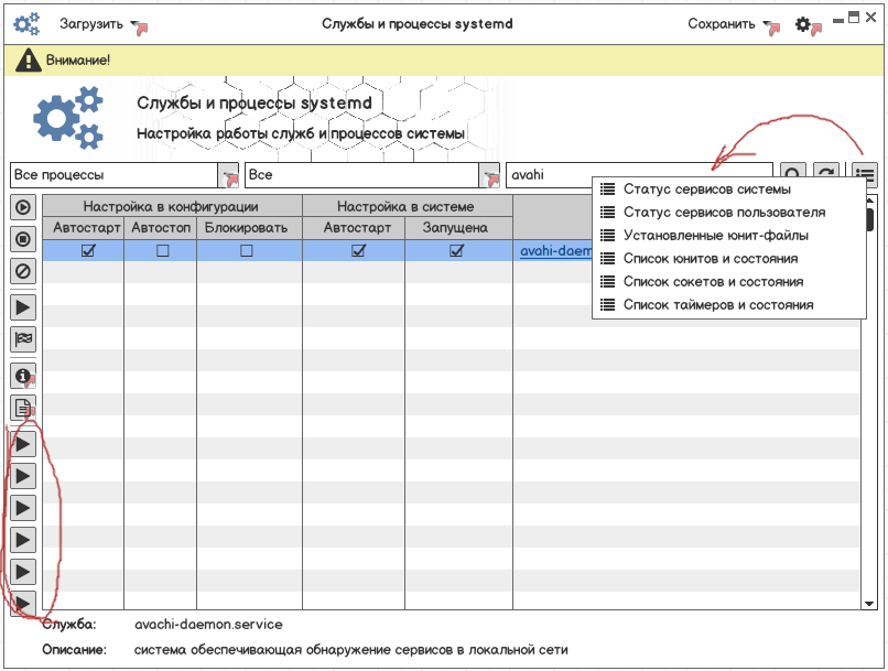 1. Кнопка "Cтатуc сервисов системы", команда выводимая в отдельном VTE не модальном окне: systemctl status --no-pager