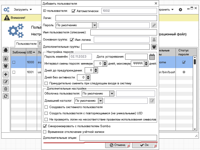Таблица "Пользователей конфигурации" столбцы: UID | Логин | Имя пользователя | Основная группа | Дополнительные группы | Дополнительные параметры | Статус пароля